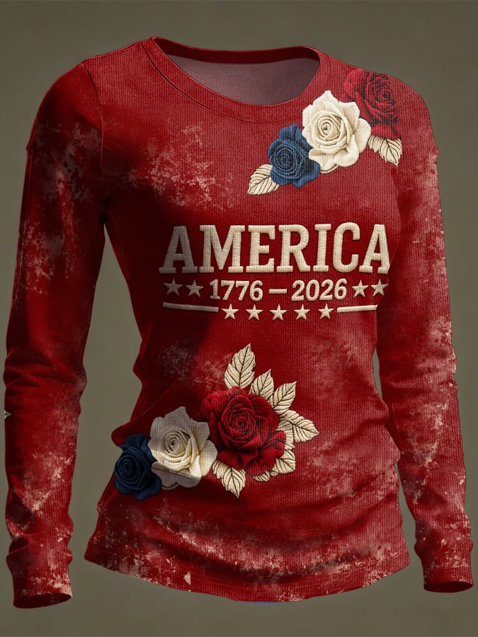 Women's casual long-sleeved T-shirt with 250th anniversary national flag and floral print.