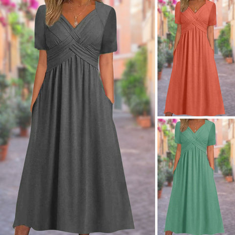 The Selby summer dress with V-neck is light and airy, ideal for warm days. With its flattering cut and feminine design, it offers both comfort and style, perfect for a relaxed, summer look.