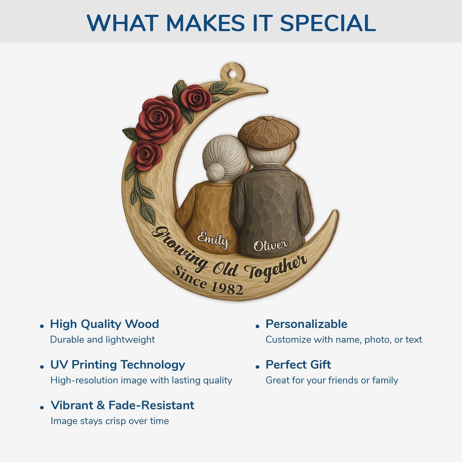 Ornament - Crescent Moon Wood with Elderly Couple & Roses, Romantic Tree Decor, unique gift for Grandparents and Couples